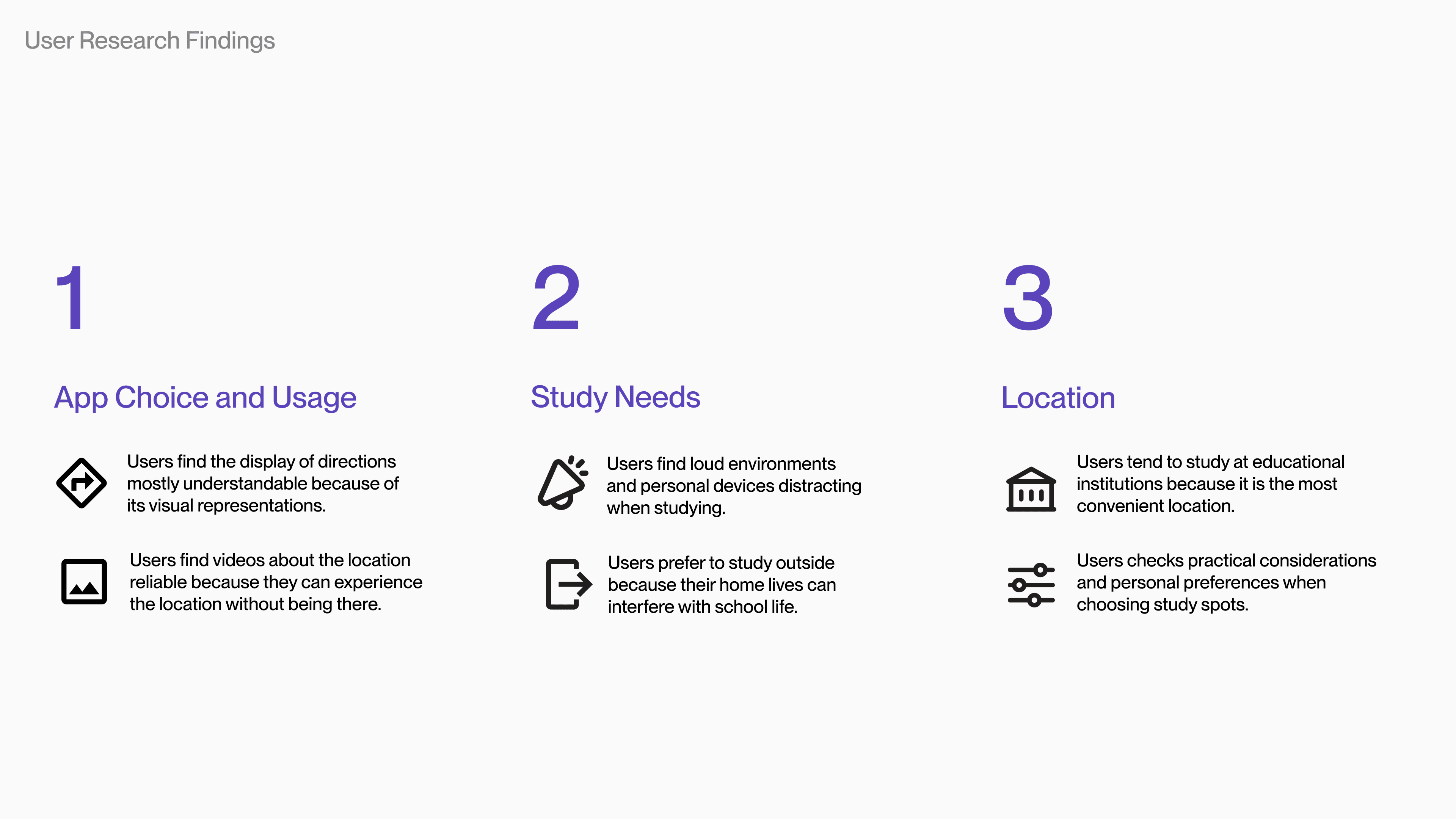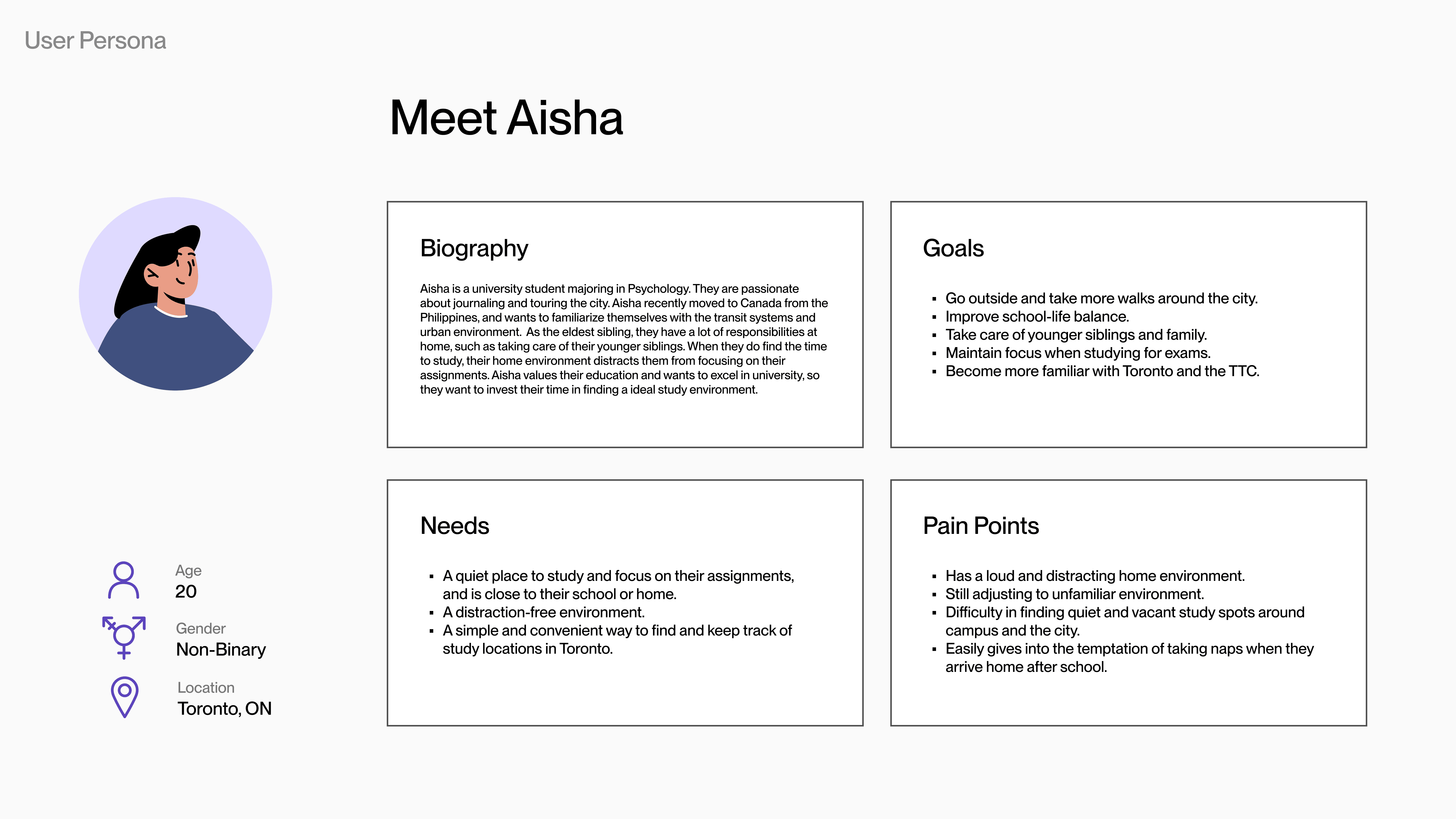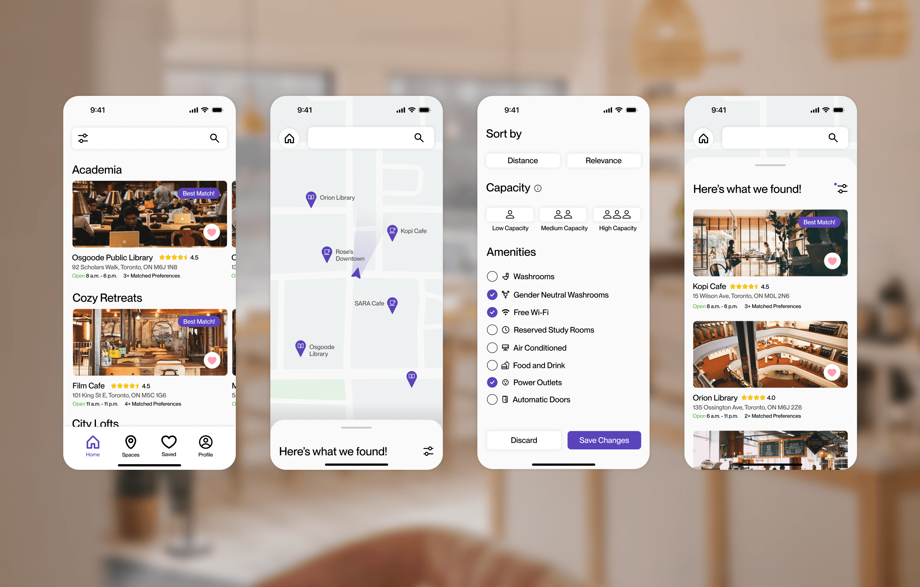 Going into this project, we asked ourselves, "How might we help students find available and accessible places to study in their neighbourhood, based on their needs and preferences?"