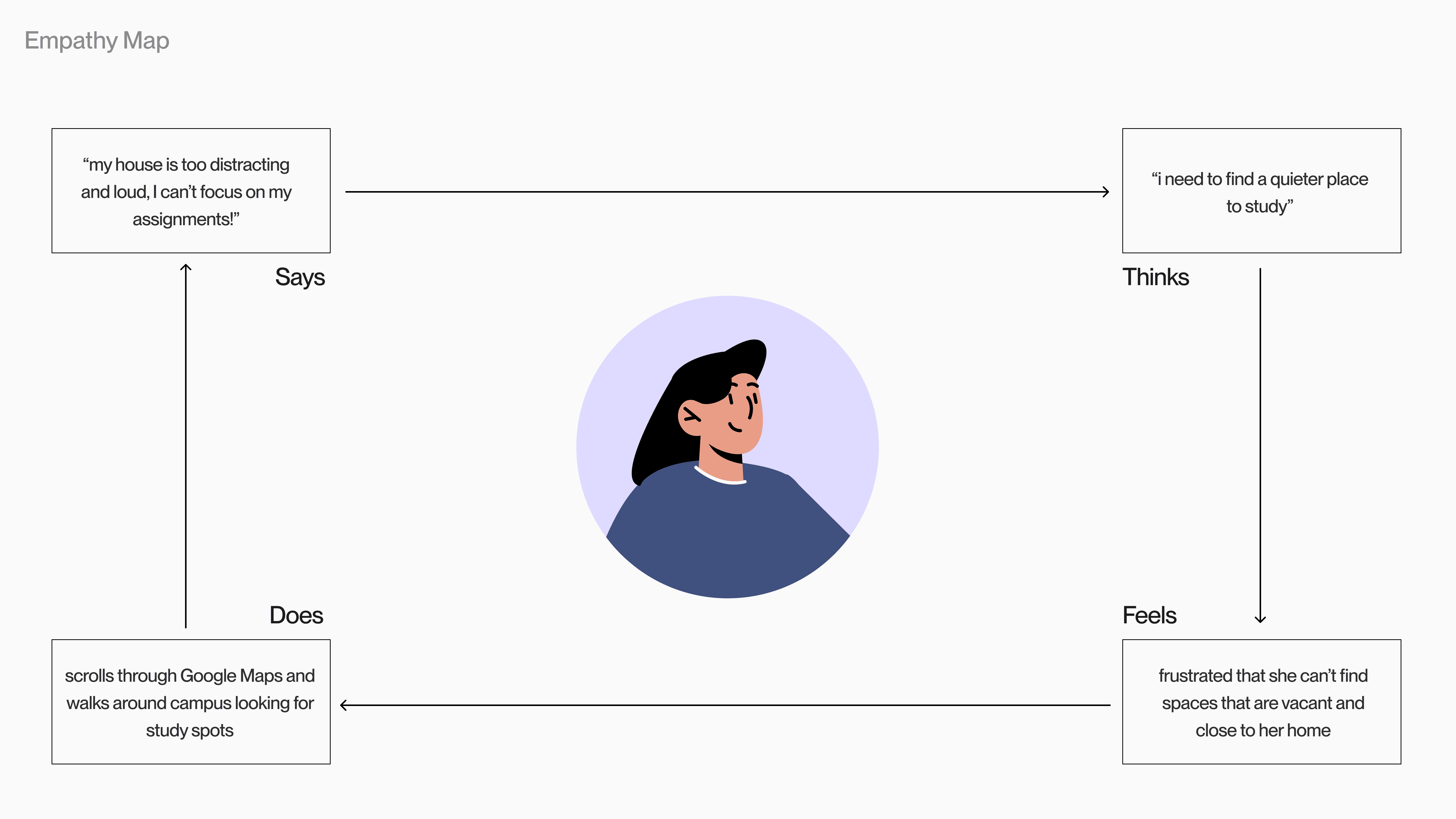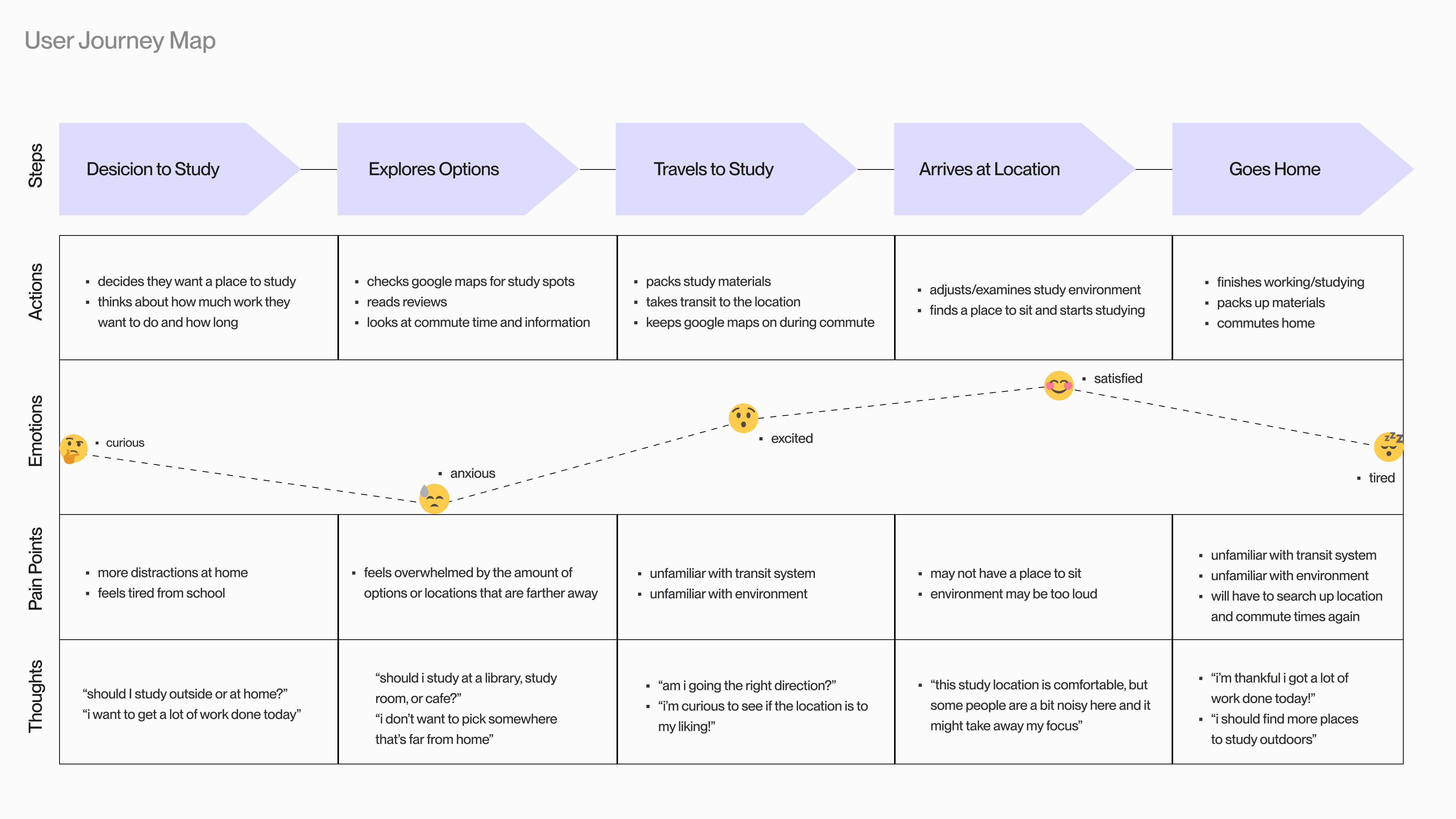 Based on our insights, a user persona and empathy map was crafted to further investigate their needs and pain points. The journey map provides a scenario where Aisha explores a new study space.