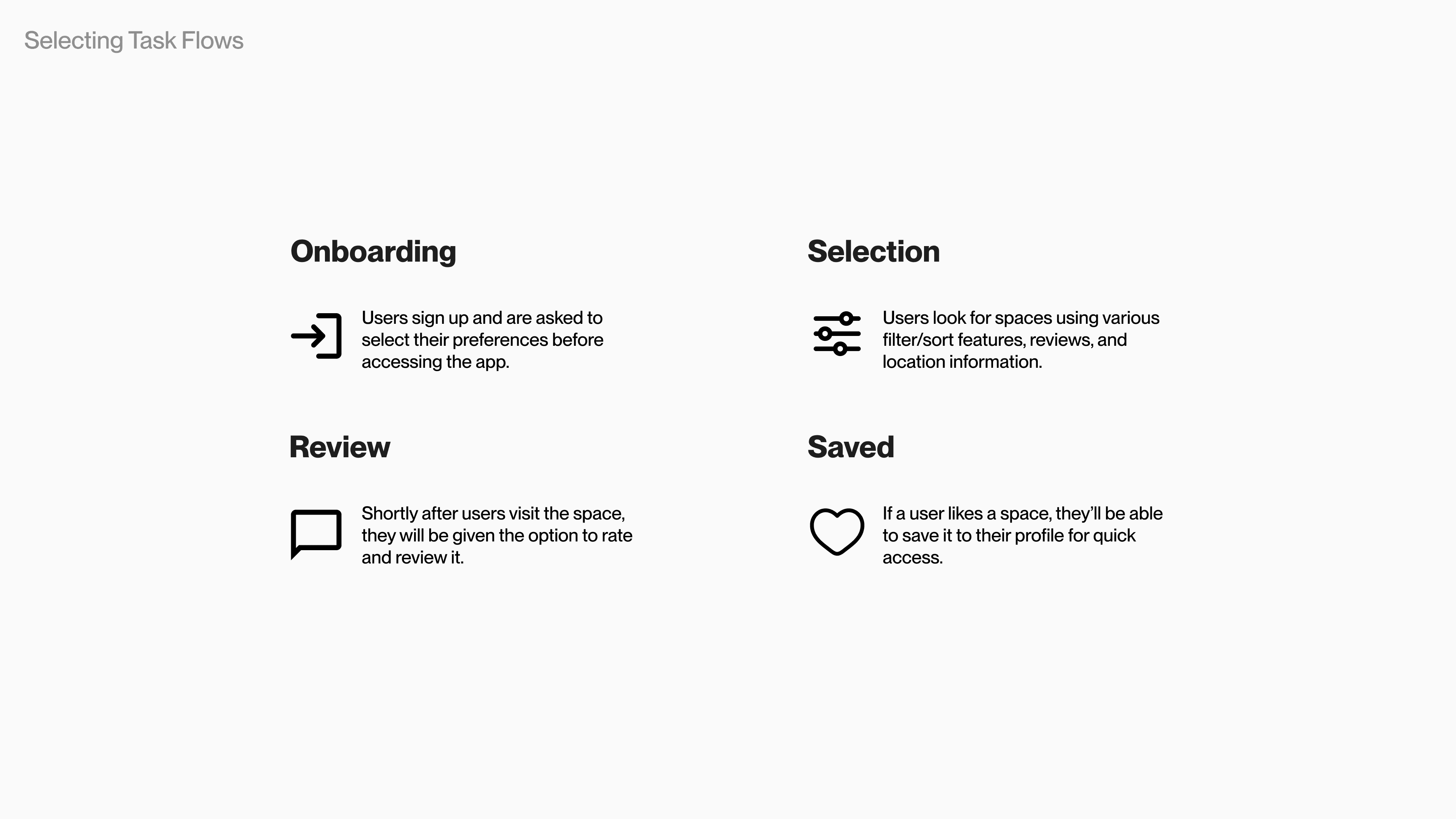 Informed by our user research, a selection of 4 key tasks from onboarding to saving a study space were created to advance our design process.