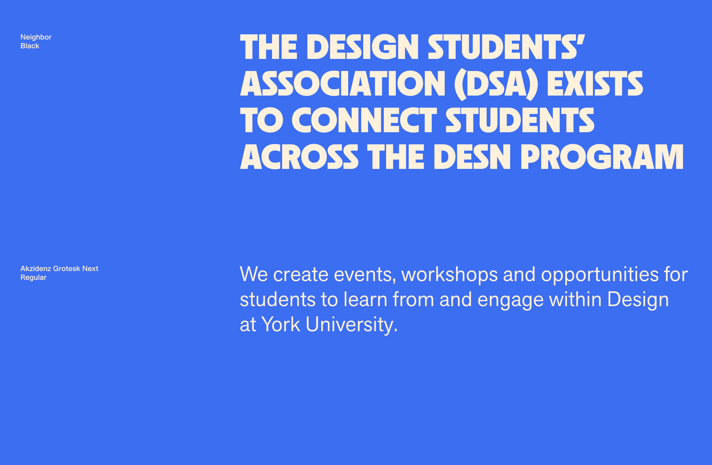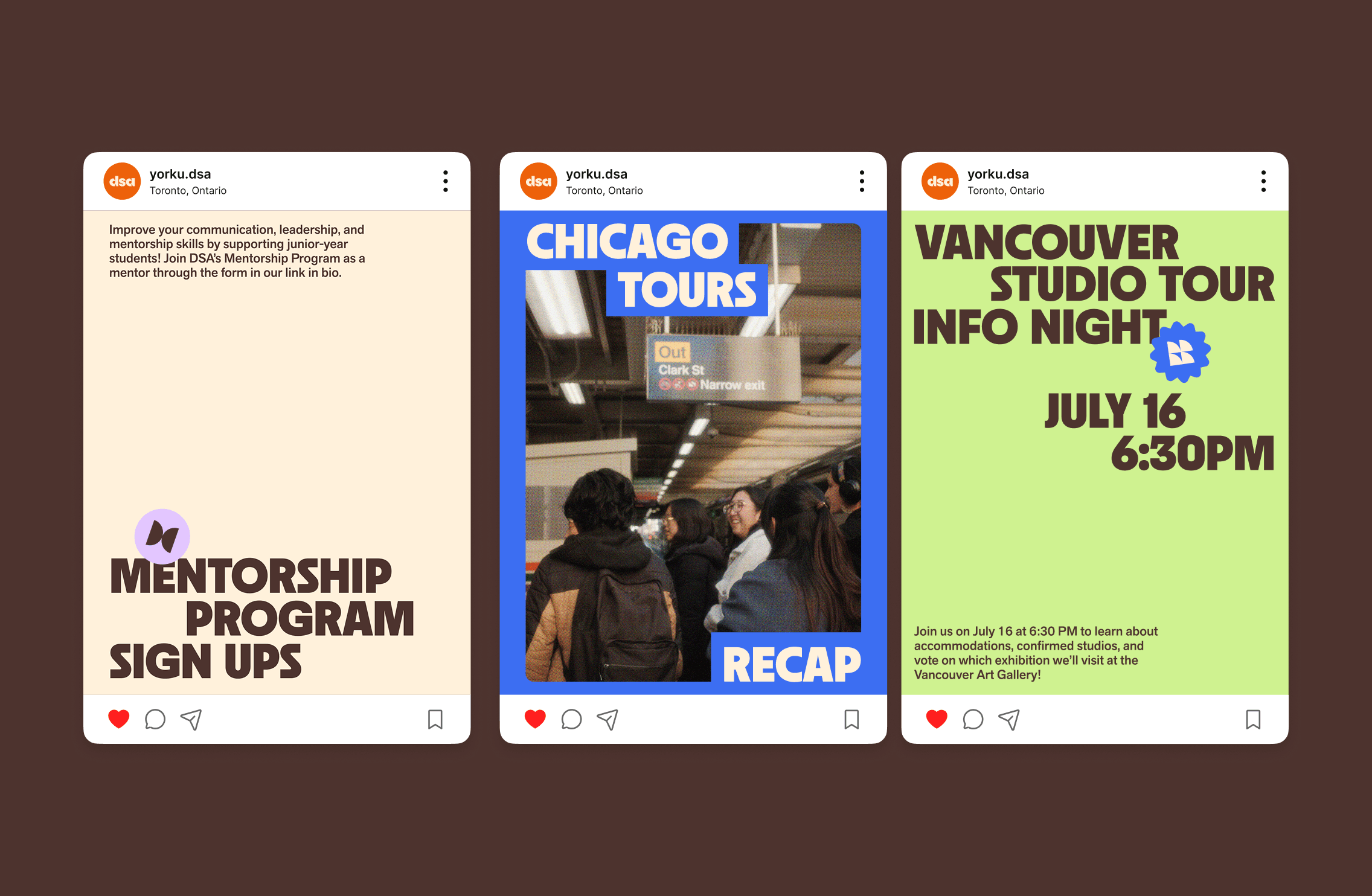 The Design Students’ Association (DSA) is a student-run organization that connects York University Design students through events, workshops, and educational opportunities. For the 2025–26 school year, I was elected to be the DSA’s Brand Director. Through this role, I worked on designing a new brand identity to be used in social media, printed promotional material, and merchandise.