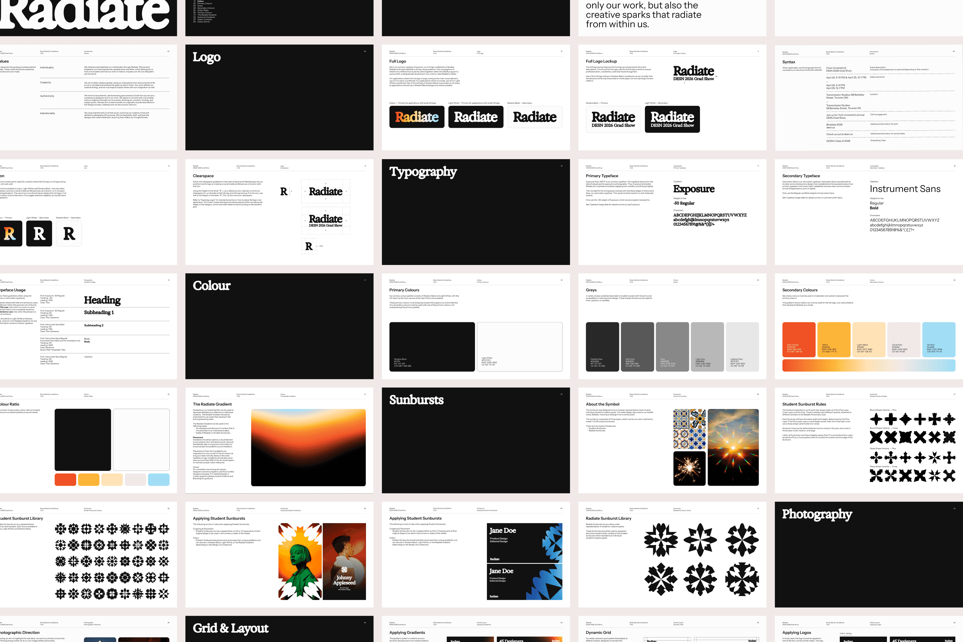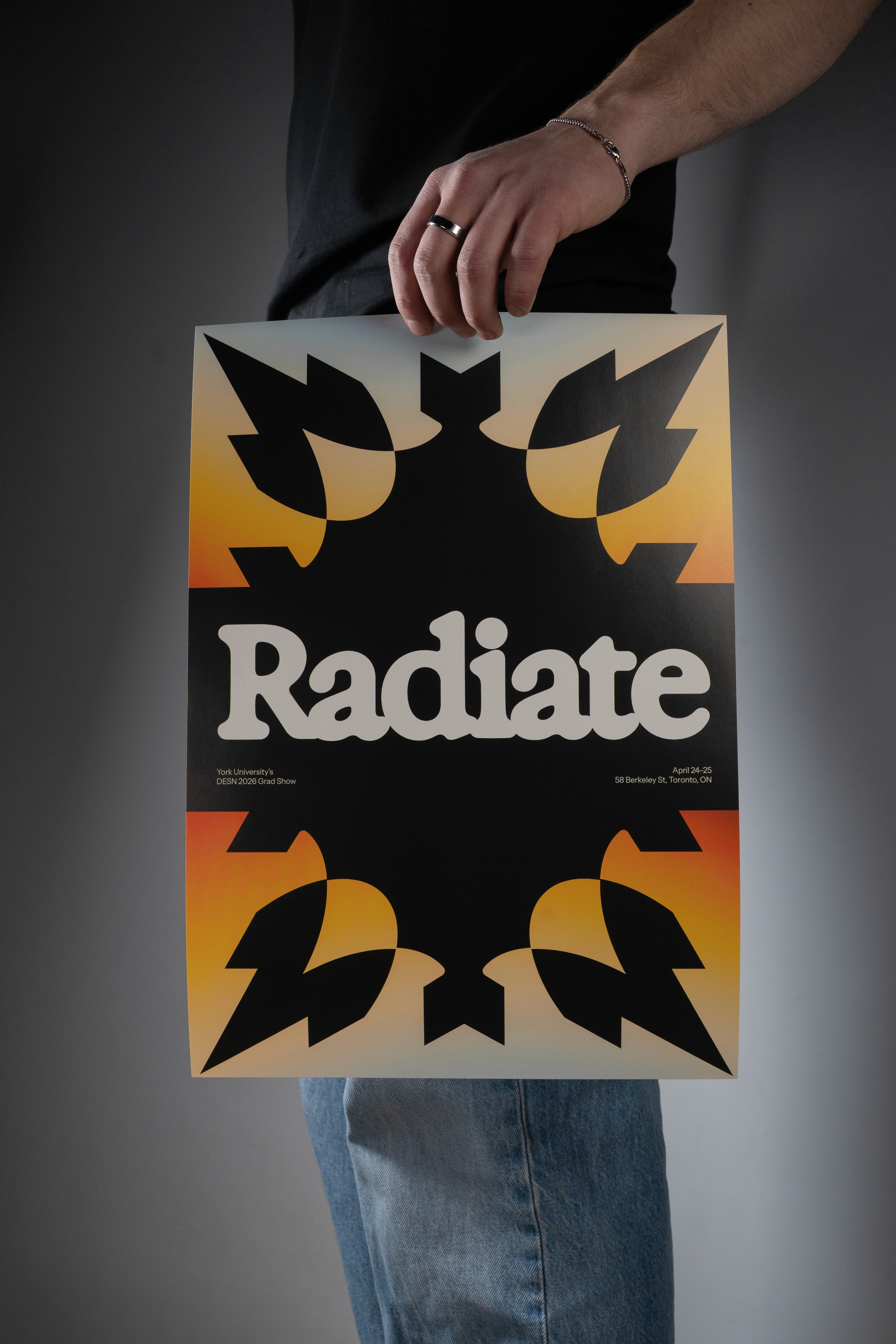 For York University's 2026 Design Cohort, I co-led a team of 9 designers to create an exhibit visual identity, that highlights evolving identities, defined by our lived experiences, perspectives, and skills. My role involved directing the creative vision of Radiate, designing various print and digital assets, and creating merchandise for sale.